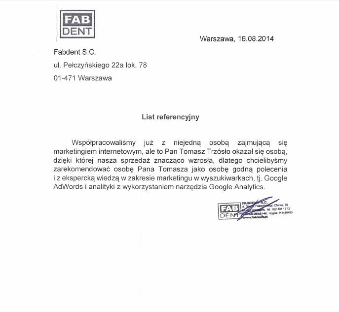 Z Panem Radosławem rozpoczęliśmy współpracę w 2013 roku rozpoczynając od Audytu kampanii Google AdWords. W kolejnych latach rozszerzaliśmy współpracę o działania z SEO i kolejne strony www (fabskin, fachowydentysta)
